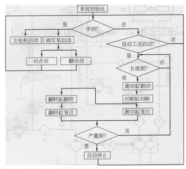 校直切斷機由機械、液壓和電控等部分組成(見圖1),在可編程計算機控制器PCC控制下,完成鋼筋的校直和切斷加工。本機器有手動液壓馬達和自動液壓馬達啊兩種工況。在手動工況下,可以實現(xiàn)主電機點動、切點動、翻點動和急停;在主電機點動時,可把螺紋鋼送入主機的送料機構(gòu);切點動可把多余的螺紋鋼切掉,翻點動可把已切斷的螺紋鋼從料臺上翻轉(zhuǎn)下來。設置手動工況更確保在設備維修和出現(xiàn)故障時也便于操作。