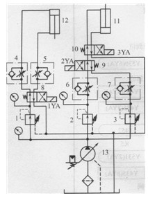 圖3 (a)所示為熱封機(jī)的液壓系統(tǒng)原理圖。系統(tǒng)的執(zhí)行器為驅(qū)動(dòng)平臺(tái)升降的液壓缸11和驅(qū)動(dòng)加熱板升降的液壓缸12,用以完成加熱和熱封時(shí)的保壓過(guò)程。系統(tǒng)的油源為限壓式變量泵13。缸11和缸12的運(yùn)動(dòng)方向分別由二位四通電磁換向閥10和8控制;為了在三個(gè)油路上獲得獨(dú)立的穩(wěn)定壓力,分別用三個(gè)減壓閥1、2、3對(duì)它們進(jìn)行調(diào)壓,減壓閥1和2用于設(shè)定加熱時(shí)的壓力,減壓閥3用于設(shè)定熱封時(shí)的壓力,從而滿足不同工作階段對(duì)壓力的需求;缸11的快速上升和慢速接近運(yùn)動(dòng)分別采用單向節(jié)流閥6、7進(jìn)油調(diào)速,并用換向閥9實(shí)現(xiàn)兩種速度的換接;由于加熱板行程較短,故采用單向節(jié)流閥4和5雙向出口節(jié)流。