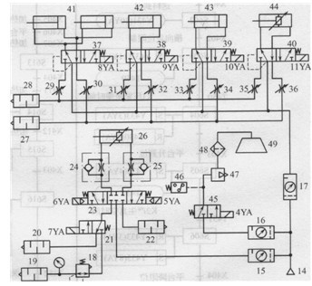 1、2、3-減壓閥;4、5、6、7-單向節(jié)流閥;8、9、10-=位四通電磁換向閥; 11-平臺(tái)升降液壓缸;12 -加熱板升降液壓缸;13 -變量葉片泵;14-氣源; 15、16、17 -氣源三聯(lián)件;18 -溢流減壓閥;19、20、22、27、28-消聲器; 21、45-二位三通電磁換向閥;23-三位六通電磁氣控?fù)Q向閥;24、25-單向節(jié)流閥; 26-加熱板進(jìn)退汽缸;29、30、31、32、33、34、35、36-節(jié)流閥; 37、38、39、40-二位五通電磁換向閥41-吸盤鉤蓋汽缸42-送料定位汽缸43-橫向定位汽缸;44-夾緊汽缸;46-壓力繼電器;47-真空發(fā)生器;48-空氣過(guò)濾器;49-真空吸盤