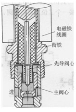 進口,A為出口。由于控制油取自A口,因而能得到恒定的二次壓力P2,所以這里的插裝閥用作減壓閥。圖6-64c中,插裝閥的控制腔再接一個二位二通電磁閥,當電磁鐵通電時,插裝閥便用作卸荷閥。