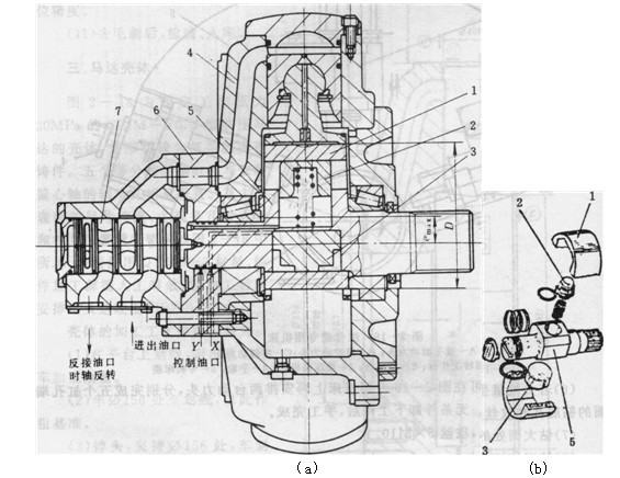 圖1所示的軸配流變量馬達(dá)的基本結(jié)構(gòu)與定量馬達(dá)相同。不同之處是它的偏心值可以改變。為了實(shí)現(xiàn)這一目的,在集流器7和星形缸體4之間加進(jìn)一個設(shè)有控制油口的隔套6,控制油從隔套經(jīng)集流器引進(jìn)曲軸5。曲軸上的偏心環(huán)1也不再與曲軸制成一體,而是做成分離的。偏心環(huán)中央是一條兩側(cè)平行的長槽,與方滑塊兩側(cè)面相配。方滑塊與馬達(dá)的輸出軸做成一體。方滑塊的另外兩面相對裝有大、小活塞3和2,在長槽里支撐著偏心環(huán)。大、小活塞腔分別與曲軸里的控制油路相連。當(dāng)Y口進(jìn)控制油(即小活塞腔進(jìn)油、大活塞腔回油)時,小活塞在壓力油的作用下將偏心環(huán)1向最大偏心方向推動。當(dāng)X口進(jìn)控制油(即小活塞腔回油、大活塞腔進(jìn)油)時,偏心環(huán)便向最小偏心方向推動。這樣就構(gòu)成了復(fù)式排量馬達(dá)。
