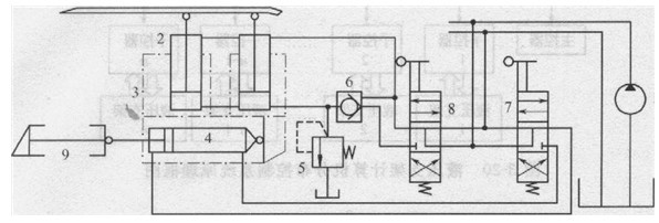 1-頂梁;2-立柱液壓缸;3-底座, 4-推移千斤頂;5-安全溢流閥;6液控單向閥; 7、8-三位四通手動(dòng)換向閥;9-刮板輸送機(jī);10-乳化液泵站;11-液箱
