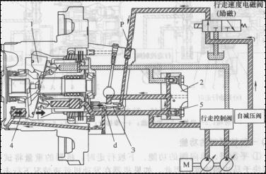 節(jié)器活塞4,并按箭頭方向把調(diào)節(jié)器活塞4向右推。所以,斜盤1向最小斜盤角度方向移動,馬達排量變小,轉(zhuǎn)速增大,轉(zhuǎn)矩卻減小。