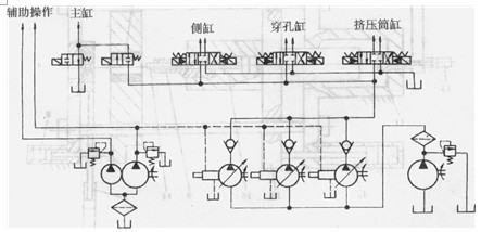 圖2所示為進行速度控制的簡化液壓系統(tǒng)圖。各液壓缸的運動速度均由變量液壓泵進行控制。在系統(tǒng)中還備有一臺雙聯(lián)定量泵作為輔助操作及先導(dǎo)控制等使用。