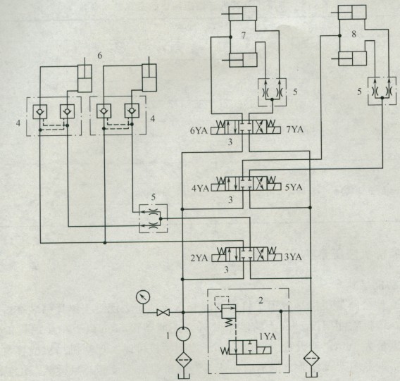 該公路架橋機(jī)共有三套獨(dú)立的液壓系統(tǒng):1號(hào)柱、2號(hào)柱各用一套液壓系統(tǒng),液壓原理圖如圖6-27所示;0號(hào)柱和3號(hào)柱合用一套液壓系統(tǒng),液壓原理圖如圖6-28所示。