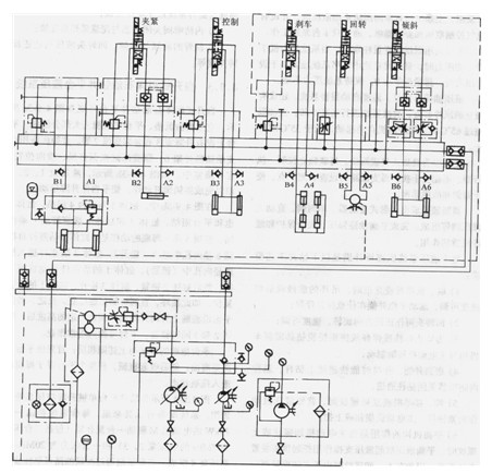 石油鉆機(jī)液壓系統(tǒng)是通過控制鉸盤來控制鉆柱的轉(zhuǎn)動(dòng)和通過控制鉸車而控制鉆柱的升降。其液壓系統(tǒng)原理如圖4.9-1所示。系統(tǒng)動(dòng)作功能分3個(gè)部分: