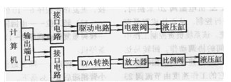 由于林木球果采集作業(yè)對動作精度不高,同時為了降低生產(chǎn)成本,便于推廣應(yīng)用,故采用開環(huán)控制的計(jì)算機(jī)數(shù)字程序控制系統(tǒng)。其控制參數(shù)有6個電磁換向閥為12個開關(guān)量,加2個電磁溢流閥,共14個開關(guān)量,2個電液比例調(diào)速閥為兩個所示。