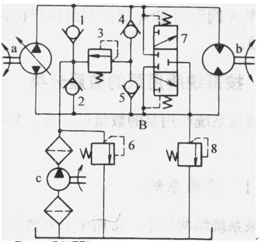 在發(fā)熱量較大的閉式系統(tǒng)中,為改善系統(tǒng)的散熱情況,需增加補油量,故增設低壓選擇閥(圖中的閥7),使系統(tǒng)經(jīng)常有部分低壓油經(jīng)閥7排回油箱。但此時輔助泵c的流量應是主泵a的流量的20%~30%。