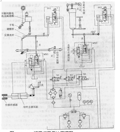 特殊情況下作手動運行時,先操作手輪,使開度與開度限制值一致(即反饋連桿與調(diào)節(jié)桿碰到一起),然后將換向閥Vl切至右位,此時即可通過手輪控制主液壓缸的位移。當(dāng)手輪朝開側(cè)轉(zhuǎn)動一定角度時,由于主配壓閥彈簧的作用,使調(diào)節(jié)桿和主配壓閥均下移相應(yīng)位移,主液壓缸即向開側(cè)運動,同時機械反饋機構(gòu)按一定的反饋系數(shù)帶動反饋連桿上移,直至調(diào)節(jié)桿回復(fù)到水平位置,即主配壓閥重新處于零位。這樣手輪轉(zhuǎn)角就與主液壓缸位移完全對應(yīng)。