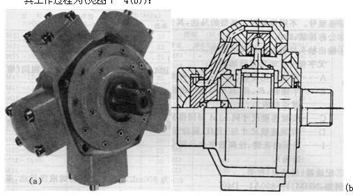 圖1(a)、圖1(b)是寧波產(chǎn)AKS型馬達的外形和原理示意圖。該馬達除了端面配流外,它的工作原理、動作過程與所有徑向曲軸連桿式單作用大扭矩馬達相一致。