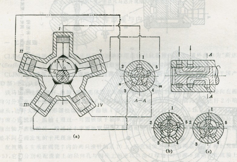 與傳統(tǒng)斯達(dá)法型馬達(dá)外形基本相同。其馬達(dá)的星形殼體4上有徑向布置的五個(gè)柱塞缸孔,每個(gè)缸孔中裝配一個(gè)活塞16,每個(gè)活塞16的球窩中部均鉸接著連桿17的球頭,球頭內(nèi)端的對開式球頭座18,被卡在活塞槽孔內(nèi)的孔用彈簧擋圈19軸向定位,連桿大頭端的凹形圓弧面剛好與曲軸的曲軸頸吻合,五只連桿大端在曲軸頸的兩側(cè)分別各用一只抱環(huán)5箍牢,使得各缸連桿在回程工作時(shí)不與曲軸頸脫離。
