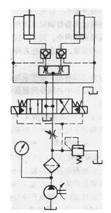 圖5為樂池升降臺液壓系統(tǒng),是原理最簡單,造價最低的一種。樂池升降臺的兩只液壓缸尺寸大小相同是由定量泵供油,利用分流閥(又稱同步閥)來實現(xiàn)兩油缸插塞運動時的同步。因此等量分流閥不管兩液壓缸的活塞桿承受的載荷有何差異,兩活塞桿仍能同步上升,從而保證升降臺剛性平移上升而不會在上升過程巾產(chǎn)生擺動。圖中的兩個液控單向閥可保證在升降臺到達某要求高度時能穩(wěn)定可靠地被支撐住而不下降。由于兩個液控單向閥在這里起到保壓支承作用,因而必須采用密封性能良好的閥件。換向閥應(yīng)采用H型巾位機能的三位四通電液動換向閥,可保證當(dāng)升降臺停止運動時,液壓缸能在較低的輸出壓力情況下卸載回到油箱。系統(tǒng)中的節(jié)流閥一方面可用來調(diào)整升降臺的速度,另一方面可保證在換向閥處于中位時,控制油路仍有一定的油壓,從而保證換向閥仍能正常換向。此外,采用H中位機能的換向閥,當(dāng)換向閥處于中位時,液控單向閥由于控制口的油壓瞬時下降到零,使閥口得以迅速關(guān)閉,可保證運動部分的可靠鎖緊,實現(xiàn)升降臺準確停留在任意位置。