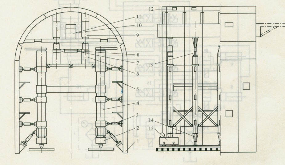 3)水平液壓缸的操作兩個(gè)水平液壓缸35和36由三位四通電磁換向閥18和19的控制,可同時(shí)動(dòng)作,也可單獨(dú)動(dòng)作,完成模板相對(duì)龍門架左、右平動(dòng),從而實(shí)現(xiàn)模板中心與隧道中心的對(duì)位。
