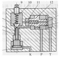 這種回路中卸荷閥的結(jié)構(gòu)是專門設(shè)計的(見圖9-llb),它與一般先導式壓力閥不同。其導閥8除了受彈簧10的力和b腔處液壓力作用外,還要承受柱塞7的推力。當蓄能器開始充油時,卸荷閥中的導閥8和主閥12都處于關(guān)閉位置,油腔a和b處的壓力都等于泵壓,柱塞兩端液壓力平衡,對導閥不產(chǎn)生推力。隨著進入蓄能器油液的不斷增多,油腔a和b中的壓力亦不斷升高;當壓力升高到b腔的液壓力能克服導閥彈簧力,將導閥打開時,P口處來的壓力油便經(jīng)阻尼孔14、導閥閥口、主閥中心孔13和通口T流回油箱。由于阻尼孔的作用,b腔壓力小于泵壓,這使主閥閥口打開,泵開始卸荷。此時b腔壓力小于a腔壓力。柱塞便對導閥施加一額外的推力,促使導閥和主閥的閥口都開得更大,結(jié)果使b腔壓力下降到零,柱塞處于其最上端位置。由于a腔的工作面積比b腔大,因此蓄能器中的壓力即使因泄漏而有所下降,卸荷閥仍能使泵處于卸荷狀態(tài)。蓄能器所能達到的最高壓力由調(diào)節(jié)螺釘9調(diào)定。