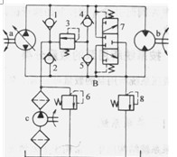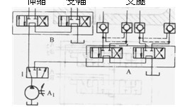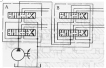 圖1. 3-7為串聯(lián)一獨(dú)聯(lián)系統(tǒng)。多路閥A控制的執(zhí)行機(jī)構(gòu)互相串聯(lián),多路閥B控制的執(zhí)行機(jī)構(gòu)也互相串聯(lián),這兩個串聯(lián)系統(tǒng)之間則由閥1使它們相獨(dú)聯(lián)。這樣在B閥操縱的執(zhí)行機(jī)構(gòu)動作時(shí),不致因誤操作A閥而引起A閥控制的執(zhí)行機(jī)構(gòu)誤動作導(dǎo)致事故。