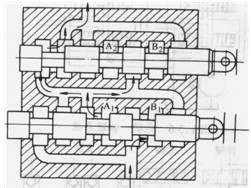 復(fù)聯(lián)系統(tǒng)是以上三種系統(tǒng)的組合,如并聯(lián)一獨(dú)聯(lián)、串聯(lián)一獨(dú)聯(lián)、串聯(lián)一并聯(lián)等系統(tǒng)。圖1. 3-6為并聯(lián)一獨(dú)聯(lián)系統(tǒng)。多路閥A控制一部分并聯(lián)的液壓執(zhí)行機(jī)構(gòu)。多路閥B則控制另一部分并聯(lián)的液壓執(zhí)行機(jī)構(gòu)。但兩個多路閥所控制的執(zhí)行機(jī)構(gòu)之間是相互獨(dú)立的。所以在B閥操縱的執(zhí)行機(jī)構(gòu)動作時(shí),即使誤操作A閥,也不會使A閥控制的執(zhí)行機(jī)構(gòu)誤動作。