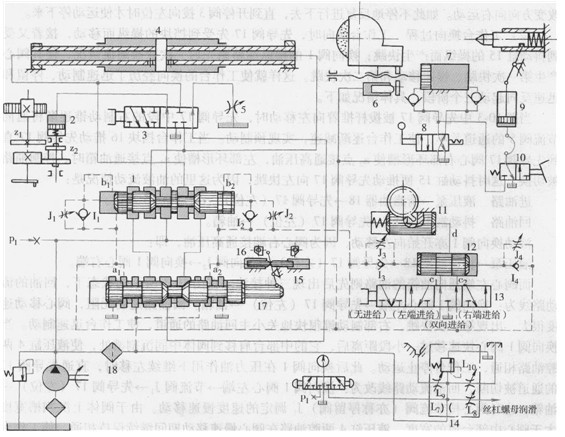 1一換向閥2-百鎖缸3-開停閥4-工作臺液址缸5-節(jié)流聞6閘缸7快動缸8-快動閥9尾架缸IO-尾架閥11-進給缸12-進給閣13-選擇閥14潤滑穩(wěn)定器15-抖動缸 16捎塊17先導閥I8精過濾器
