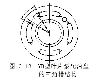 在結(jié)構(gòu)上要保證吸油腔和壓油腔互不串通,故運轉(zhuǎn)過程中將存在閉死容積。雙作用葉片泵理論上閉死容積不變化,不產(chǎn)生困油現(xiàn)象,但實際上考慮葉片厚度則會有困油現(xiàn)象,為此在壓油窗口開有三角槽(如圖3-13),所示以防困油現(xiàn)象的產(chǎn)生。