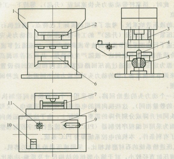 VIS系列墻地磚液壓馬達(dá)系統(tǒng)是我國從意大利引進(jìn)的建材生產(chǎn)設(shè)備,主要用于瓷磚坯的壓制生產(chǎn)。該系列壓機(jī)有800、1000、1200、1500、2000等幾種不同規(guī)格型式,其結(jié)構(gòu)和液壓系統(tǒng)有很多類同之處,現(xiàn)以VIS800型液壓機(jī)為例,著重介紹其液壓系統(tǒng)的工作原理和技術(shù)特點(diǎn)。該機(jī)由主機(jī)、液壓馬達(dá)系統(tǒng)和電控系統(tǒng)組成,其主機(jī)(見圖1)由機(jī)體,模具(上模和下模),保證上、下橫在壓制過程中的對心的滑塊導(dǎo)桿,用于排氣的橡膠柱、頂桿,送料裝置(推板)等組成。工作時(shí),送料裝置7將陶瓷粉料送至下模腔中,然后上模下降,進(jìn)行壓制加工。上、下模模腔可根據(jù)所生產(chǎn)的瓷磚規(guī)格進(jìn)行更換。